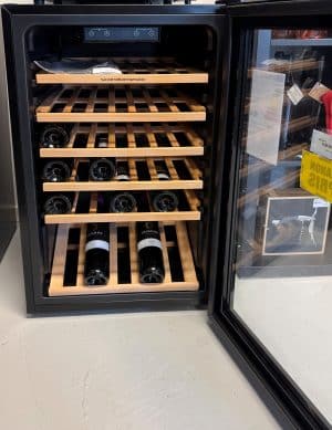 SV45BOBS. Dette er en udstillingsvare – dvs. den er uden original indpakning og står i butikken til syne for kunden. Der kan forekomme små ridser og buler. Leveres på Bornholm for 99 kr. Skal varen sejles/leveres uden for Bornholm bør man kontakte butikken for nærmere leveringspris. SV45B er et elegant fritstående vinskab med én temperaturzone, kapacitet til 45 flasker og justerbar temperatur mellem 4–22°C. Med rammeløs glasdør, LED-belysning og anti-vibrationskøling sikrer det optimal og stilfuld opbevaring af din vin. Det digitale kontrolpanel gør det nemt at styre og overvåge temperaturen.