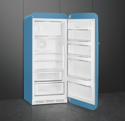Køleskab fra Smeg i lyseblå mat med fryseboks, grøntsagsskuffe og LED belysning. Læs hele beskrivelsen