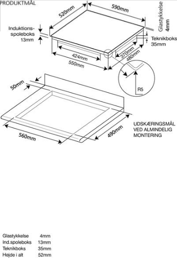 - Bagerste zoner: 2 Ø21 cm – 2300 W / Booster: 2900 W / Dobbeltbooster: 3700 W (min. grydestr. Ø13,5 cm)